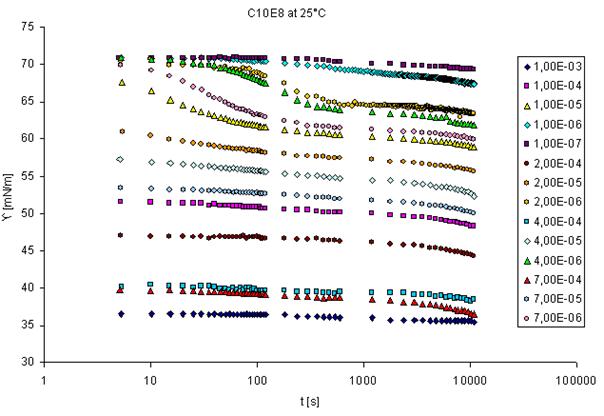 The adsorption dynamics is best studied by measuring the dynamic surface tension, or in case of interfaces between two immiscible liquids the dynamic interfacial tension. There are various methods available for such measurements having different time windows. Methods with complementary time windows are needed, even for the study of one surfactant, as the rate of adsorption depends on its surface activity and the concentration in the solution bulk. This is best seen from the following graph which shows the dynamic surface tension measured with a drop shape technique (see PAT-1M and PAT-2S, products of SINTERFACE).