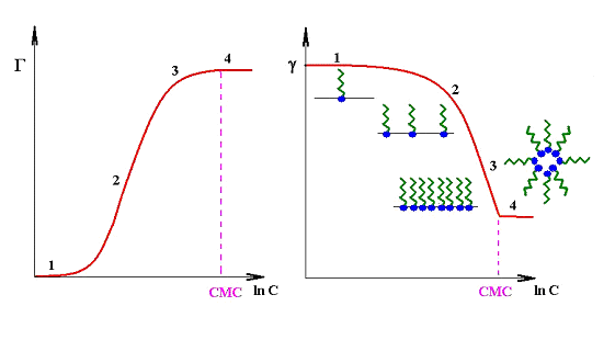 When a certain bulk concentration of the surfactant is reached and the surface is completely covered so that no further molecules can be adsorbed at the interface, further surfactant molecules form aggregates in the solution bulk, micelles. At this so-called critical micelle concentration CMC, Γ becomes essentially constant, and also the surface tension gamma shows a kink and remains almost constant above the CMC.