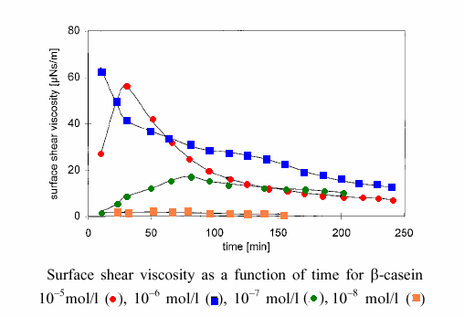 The surface shear viscosity of ß-casein is shown in the following figure. Depending on the bulk concentration, the shear viscosity increases and then drops down again.