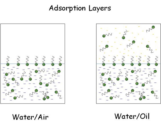 Key parameters of adsorption layers are the dynamics of adsorption during their formation, the equilibrium parameters of adsorption, and the rheological behaviour, including the elasticity and viscosity of dilation and shear (in a broad frequency interval). At the interface between two immiscible liquid, such as water and oil, molecules adsorb and partly pass into the oil phase. The distribution of the surfactant between the two phases is given by the distribution coefficient.