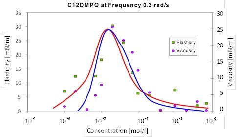 With increasing bulk concentration the elasticity E' increases and passes through a maximum. The same happens with the viscous term E", as one can see in the following graph showing results for a model surfactant (dodecyl dimethyl phosphine oxide) at a frequency of 0.3 rad/s = 0.048 Hz.